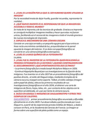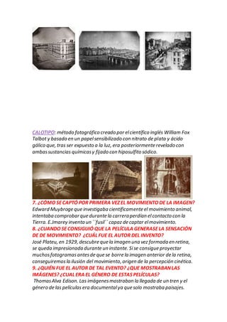 El documento resume la historia del desarrollo de la fotografía y el cine, desde las primeras cámaras oscuras y daguerrotipos hasta la invención del cine sonoro y la televisión. Algunos hitos importantes incluyen la primera fotografía de Joseph Nicéphore Niépce en 1826, el desarrollo del daguerrotipo y el calotipo, la captura del movimiento por Muybridge, la creación de películas por Edison que mostraban imágenes en movimiento, y las primeras transmisiones públic