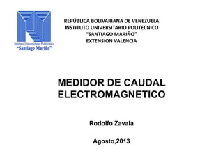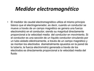 El documento describe el funcionamiento de un medidor de caudal electromagnético. Utiliza el principio de que cuando un conductor se mueve a través de un campo magnético, se genera una fuerza electromotriz proporcional a la velocidad del fluido. Consta de un tubo de caudal con bobinas magnéticas y electrodos, y un transmisor que convierte la señal de milivoltios en una salida adecuada para indicación y control. Tiene una precisión del 0.25 al 1% y no requiere contacto con el fluido medido.