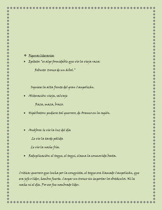 El documento describe las características de un soneto dedicado a Caupolicán, un guerrero mapuche. El soneto tiene dos cuartetos y dos tercetos con rima consonante perfecta. Los versos son alejandrinos de arte mayor con un ritmo imperfecto. Se utilizan figuras literarias como epítetos, aliteración, hipérbaton y anáfora para describir la fuerza y liderazgo de Caupolicán.