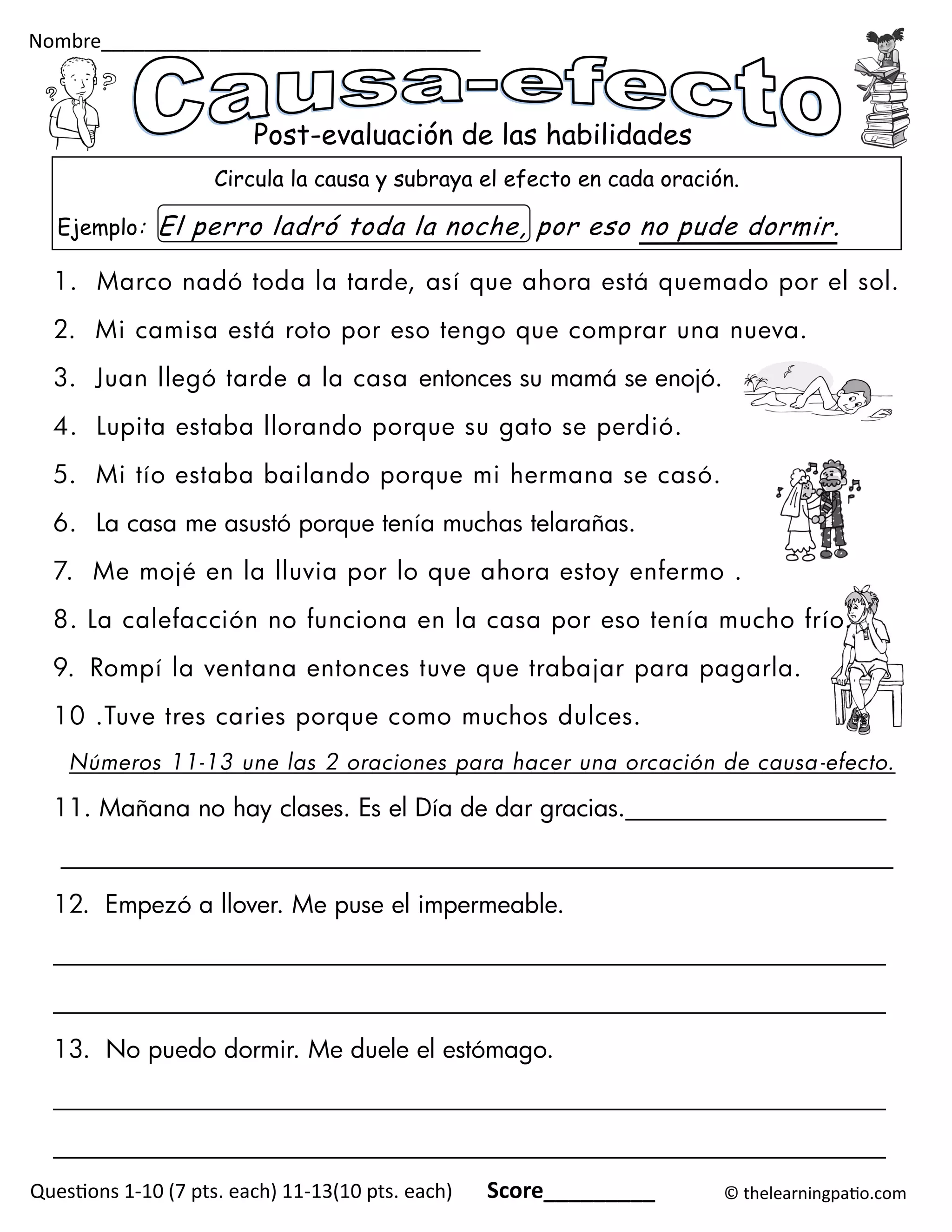 Este documento presenta un ejercicio para identificar la causa y el efecto en oraciones individuales y unir oraciones para formar una oración de causa y efecto. El estudiante debe identificar la causa y el efecto en 13 oraciones y unir 3 pares de oraciones para formar una oración de causa y efecto.