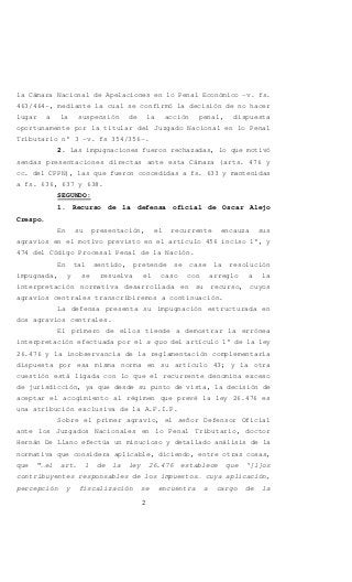 El documento presenta el resumen de un recurso de casación interpuesto por la defensa de Oscar Alejo Crespo contra una resolución que confirmó no hacer lugar a la suspensión de la acción penal en su contra. El recurrente plantea dos agravios principales: 1) que se interpretó erróneamente la ley 26.476 que establece el régimen de regularización tributaria y no se observó su reglamentación, y 2) que corresponde a la AFIP exclusivamente decidir sobre el acogimiento al régimen. Sostiene que las deudas derivadas del decaimiento de