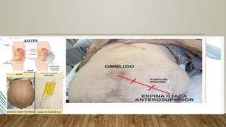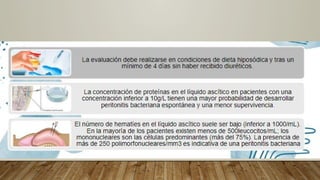 La ascitis puede ser causada por diversas condiciones como la carcinomatosis peritoneal, peritonitis tuberculosa, insuficiencia cardiaca, pancreatitis e síndrome nefrótico, siendo la cirrosis hepática la enfermedad más relevante en su patogenia. Esta afección se relaciona con la hipertensión portal y trastornos de la función renal, y su tratamiento incluye dieta hiposódica, diuréticos y paracentesis. El diagnóstico y manejo de la ascitis requieren una comprensión clara de las distintas fases de la cirrosis hepática.