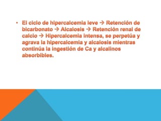 Este documento describe las causas de la hipercalcemia, incluyendo el hiperparatiroidismo primario, cánceres, intoxicación por vitamina D, y enfermedades renales. También explica los síntomas, diagnóstico y tratamiento de la hipercalcemia, el cual se enfoca en la hidratación del paciente y tratamiento de la causa subyacente.