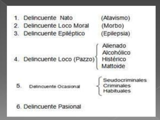 Este documento describe varias causas endógenas y exógenas de la criminalidad. Entre las causas endógenas se encuentran la morfología, biotipología y psicología criminal, incluyendo teorías como la de Lombroso sobre rasgos físicos de criminales. También describe diversos tipos de delincuentes como el epiléptico, el habitual, el ocasional y el profesional. Las causas exógenas incluyen factores ambientales y sociales.