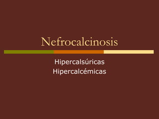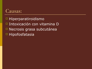 El documento describe varias causas de nefrocalcinosis, incluyendo hiperparatiroidismo, intoxicación con vitamina D, necrosis grasa subcutánea e hipofosfatasia. Esta última es una enfermedad metabólica caracterizada por defectos esqueléticos similares al raquitismo debido a fallos en el depósito mineral en el hueso. El hiperparatiroidismo primario se debe a la hipersecreción de hormona paratiroidea y causa hipercalcemia e hipercalciuria.