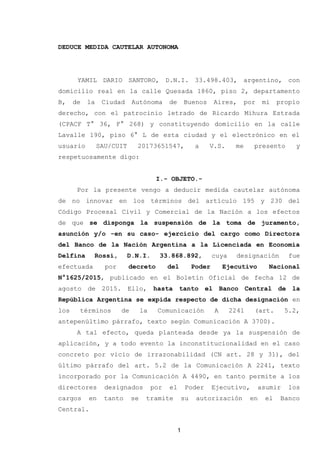 El documento presenta una solicitud de medida cautelar autónoma para suspender la designación de Delfina Rossi como Directora del Banco de la Nación Argentina. Argumenta que la designación es ilegal porque Rossi carece de la idoneidad requerida, ya que no tiene experiencia en el sector financiero argentino y su nombramiento se debió a nepotismo por ser hija del Ministro de Defensa. Se alega también que la designación viola normas del Banco Central y la Carta Orgánica del Banco de la Nación sobre representatividad e idoneidad de los direct