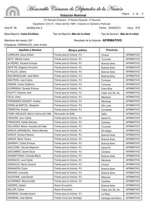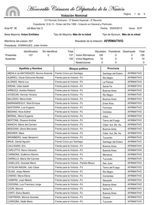 El documento presenta los resultados de una votación en la Cámara de Diputados de la Nación en la que 126 diputados votaron a favor, 10 se abstuvieron, y 137 estuvieron presentes. Se lista el nombre y provincia de cada diputado y su voto a favor o abstención.