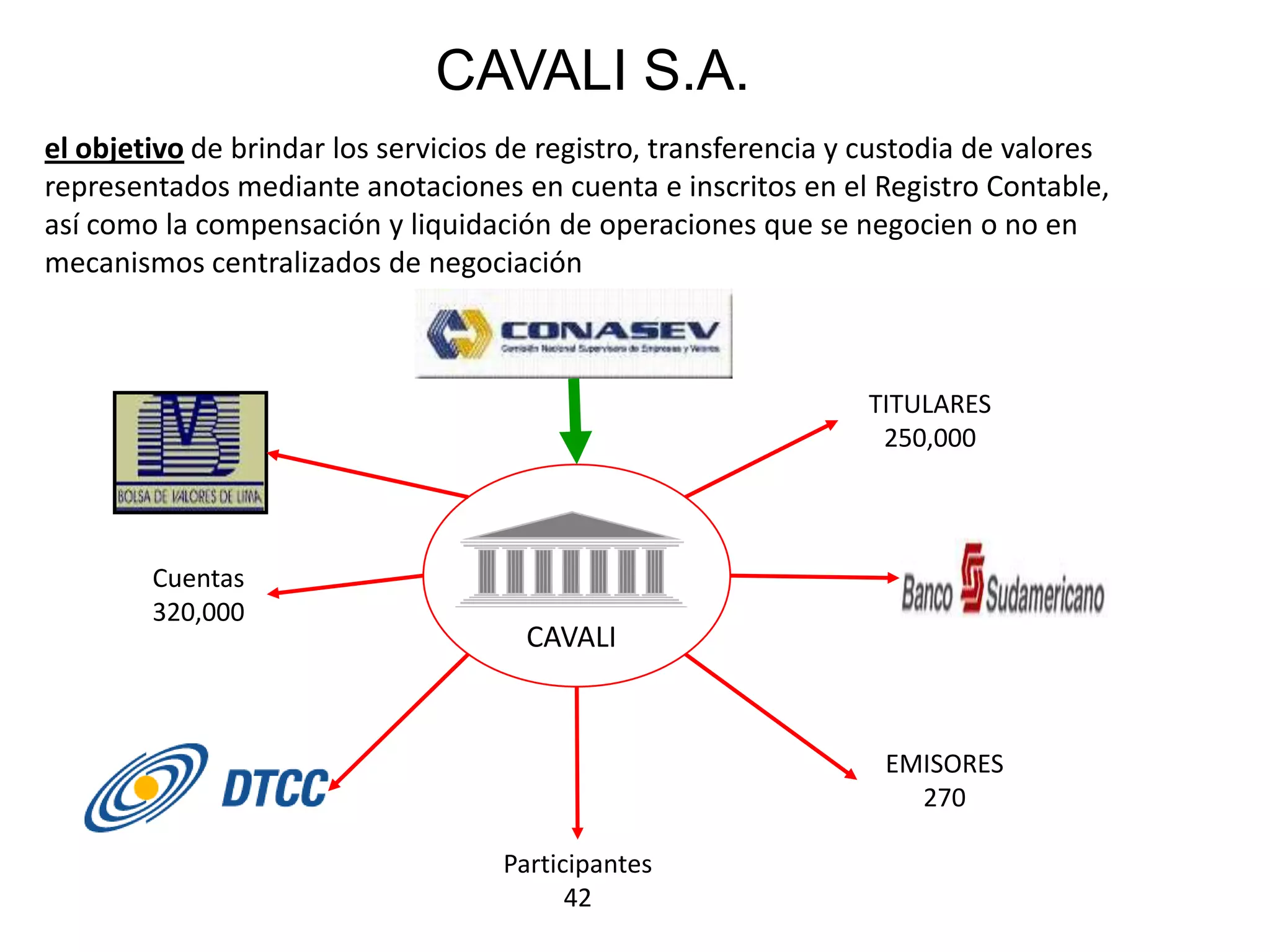 CAVALI S.A. es una institución que brinda servicios de registro, transferencia y custodia de valores representados mediante anotaciones en cuenta e inscritos en el Registro Contable, así como la compensación y liquidación de operaciones. Cuenta con 320,000 cuentas de titulares, 270 emisores y 42 participantes. Ofrece servicios de registro para una amplia gama de valores elegibles, incluyendo valores nacionales y extranjeros emitidos por gobiernos, empresas y derivados autorizados.