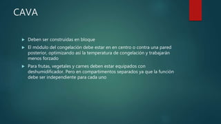 El documento proporciona recomendaciones para diseñar, optimizar y almacenar alimentos en cavas. Sugiere construir las cavas en bloque y ubicar el módulo de congelación en el centro o contra una pared posterior. Además, recomienda separar los diferentes tipos de alimentos en módulos independientes y controlar la temperatura y humedad de cada uno de acuerdo a sus necesidades, como carnes a -1°C a 2°C y 70-75% de humedad, y frutas y verduras a 4°C a
