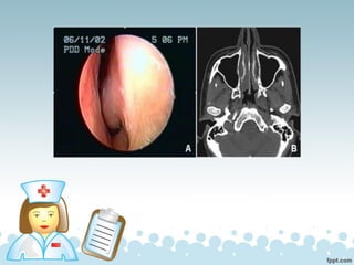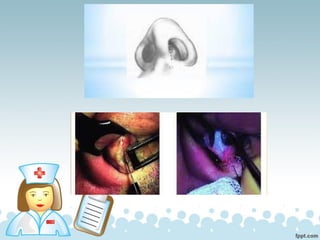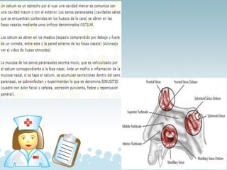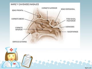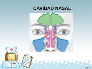 El documento describe la anatomía de la cavidad nasal. Resume que la cavidad nasal está recubierta por una membrana mucosa que calienta y humedece el aire, y contiene pelos que filtran partículas. Explica que la irrigación sanguínea proviene de las arterias oftálmica, maxilar y facial, y el drenaje venoso va a las venas oftálmica y facial. Además, detalla algunas técnicas quirúrgicas como la extracción de cuerpos extraños, electrocoagulación de cornet