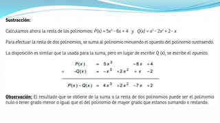 Este documento describe las expresiones algebraicas y los polinomios. Define un monomio como una expresión algebraica con un solo término y sin operaciones de suma o resta. Un polinomio se define como la suma algebraica de monomios. Explica cómo clasificar polinomios según su grado, ordenarlos, y realizar operaciones como suma, multiplicación y división con ellos.