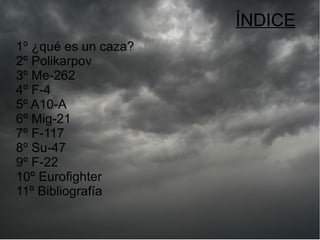 Este documento resume diferentes modelos de cazas de combate, incluyendo el Polikarpov de la Segunda Guerra Mundial, el primer caza a reacción Me-262 y cazas más modernos como el F-22 Raptor estadounidense y el Eurofighter Typhoon europeo. Explica brevemente las características y funciones de cada caza y cómo han evolucionado para adaptarse a las necesidades tácticas y tecnológicas a lo largo de la historia.