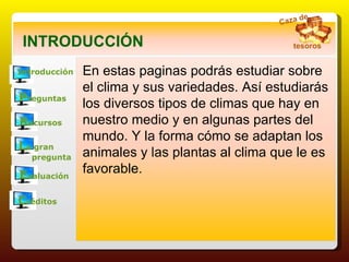 Este documento presenta información sobre los diferentes tipos de clima. Explica que cubrirá los diversos climas que existen en el medio ambiente y cómo los animales y plantas se adaptan a los climas favorables. Incluye preguntas sobre conceptos climáticos básicos, enlaces a recursos adicionales y una pregunta para evaluar si el clima cálido es indispensable para la vida.