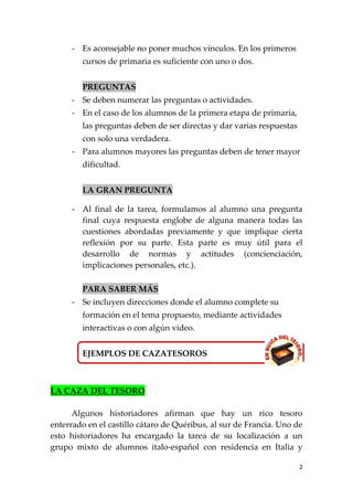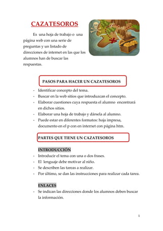 Este documento proporciona información sobre cazatesoros, que son hojas de trabajo o páginas web con preguntas sobre un tema y enlaces a sitios web donde los estudiantes pueden encontrar las respuestas. Explica los pasos para crear un cazatesoros, incluyendo identificar un tema, encontrar sitios web relevantes, formular preguntas y dar las hojas de trabajo a los estudiantes. También describe las partes comunes de un cazatesoros, como la introducción, enlaces, preguntas y una pregunta final de reflexión