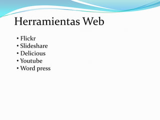 Las herramientas web 2.0 mencionadas incluyen Flickr para compartir fotos, Slideshare para compartir presentaciones, Delicious para marcar y compartir enlaces web favoritos, Youtube para compartir videos y Word press para crear y administrar blogs.