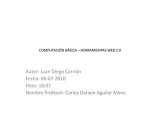 El documento habla sobre herramientas web 2.0 básicas. Menciona cinco herramientas principales: Yahoo, Delicious, YouTube, SlideShare y Flickr. El autor es Juan Diego Carrión y fue escrito el 06-07-2010 a las 16:07 para el profesor Carlos Darwin Aguilar Mora.