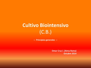 El Cultivo Biointensivo (C.B.) es un método de producción de alimentos que utiliza áreas de producción más pequeñas para obtener mayores rendimientos, minimizando el uso de agua, fertilizantes y pesticidas ecológicos. Los principios del C.B. incluyen trabajar con los ciclos naturales, crear diversidad y balance, y reconocer patrones recurrentes. Las bases del C.B. son la preparación profunda del suelo y la composta, la cual ayuda a incrementar la retención de humedad y fertilidad del suelo