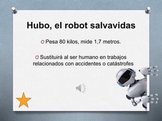 Hubo es un robot salvavidas desarrollado en Corea del Sur que mide 1.7 metros y pesa 80 kilos, diseñado para sustituir al ser humano en trabajos de rescate relacionados con accidentes o catástrofes. Un grupo de científicos en la ciudad de Daejeon está creando a Hubo para que pueda realizar tareas de búsqueda y rescate en entornos peligrosos. Según una encuesta a 10 estudiantes universitarios, la idea de Hubo parece tener buen apoyo público y se espera que continúe