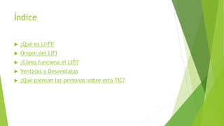 El documento describe la tecnología LI-FI, que transmite datos a través de la luz visible en lugar de las ondas de radio como Wi-Fi. Explica que LI-FI fue propuesto en 2010 por el físico Harald Haas y puede alcanzar velocidades de hasta 3 Gbps, es más barato que Wi-Fi, y es seguro para la salud. Sin embargo, LI-FI no puede atravesar paredes y es más sensible al movimiento. La mayoría de las personas encuestadas consideran útil esta tecnología pero menos personas estarían dispuestas a comprarla.