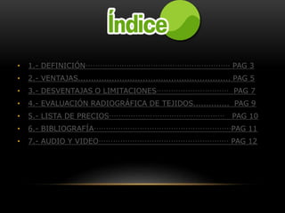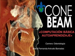 El documento describe la tomografía computarizada de haz cónico (CBCT), el sistema más completo de imágenes odontológicas y maxilofaciales. Genera imágenes volumétricas en 3D utilizando un haz de rayos X en forma de cono que gira alrededor de la cabeza del paciente para recoger imágenes de base y construir datos volumétricos 3D. Proporciona imágenes reconstruidas multiplanares sin distorsión ni aumento, con menor dosis de radiación y costo que otros métodos.