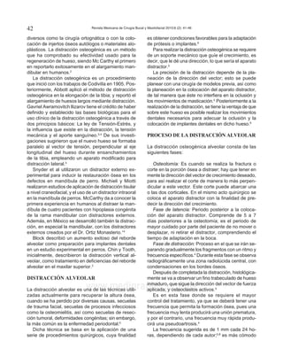 Este documento presenta una revisión de la técnica quirúrgica de distracción alveolar para aumentar la altura del reborde alveolar. Describe el proceso de distracción alveolar, incluyendo la osteotomía, la fase de latencia, la fase de distracción y la consolidación. También discute los tipos de aparatos distractores alveolares, las posibles complicaciones en cada fase del proceso, y ejemplos de su uso para reconstrucciones mandibulares. Finalmente, presenta un caso clínico de distracción al