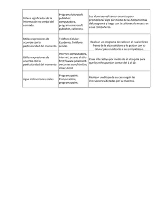 El documento describe una serie de unidades y competencias relacionadas con el área de comunicación y lenguaje, educación física. Para cada competencia se proponen recursos y actividades didácticas. Las actividades involucran el uso de tecnología como computadoras, programas informáticos e internet para reforzar el aprendizaje de vocabulario, estructuras gramaticales y expresión oral y escrita en diferentes idiomas. También se incluyen actividades físicas utilizando materiales como pelotas, cronómetros y música.