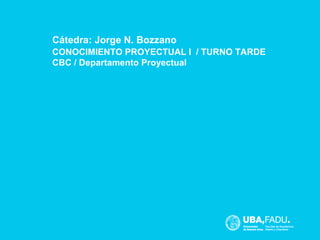 Este documento presenta los objetivos y proyectos de la asignatura "Conocimiento Proyectual I" dictada en el CBC de la Universidad de Buenos Aires. La asignatura busca que los estudiantes desarrollen habilidades en el uso de lenguajes, trabajo en grupo, pensamiento interdisciplinario y abordaje de problemas reales con un enfoque sistemático. Los proyectos propuestos incluyen el diseño de una campaña para una organización social, un recorrido espacial basado en principios de la Bauhaus y el diseño de un objeto a