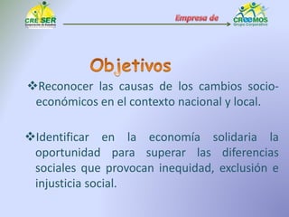 1. El documento habla sobre la economía solidaria y sus principios. 2. Reconoce que la economía solidaria ofrece oportunidades para superar las diferencias sociales que causan inequidad e injusticia. 3. Describe los principios de la economía solidaria como la ayuda mutua, solidaridad, participación democrática y equidad.