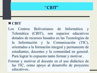 Los Centros Bolivarianos de Informática y Telemática (CBIT) son espacios educativos con recursos tecnológicos que tienen el objetivo de formar e integrar a estudiantes, docentes y la comunidad en general. Los CBIT buscan formar y motivar a los docentes en el uso pedagógico de las tecnologías de la información para apoyar el desarrollo de proyectos educativos.