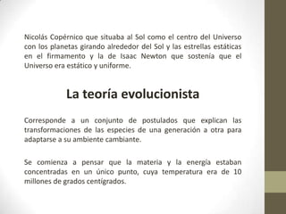Este documento resume la evolución del universo desde la teoría del Big Bang hace 14 mil millones de años hasta la formación de la Tierra hace 4,500 millones de años. Explica que la materia y energía se concentraron en un punto que explotó, expandiendo partículas a través del espacio y dando origen a nuestro universo, según la teoría del Big Bang.