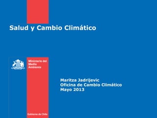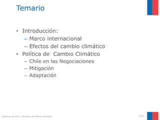 Este documento presenta información sobre el cambio climático y la política de cambio climático de Chile. Explica el marco internacional del cambio climático, los efectos del cambio climático en Chile, la política de mitigación y adaptación de Chile, y el papel de Chile en las negociaciones internacionales sobre el cambio climático.