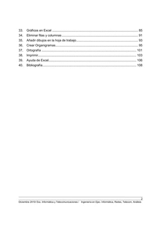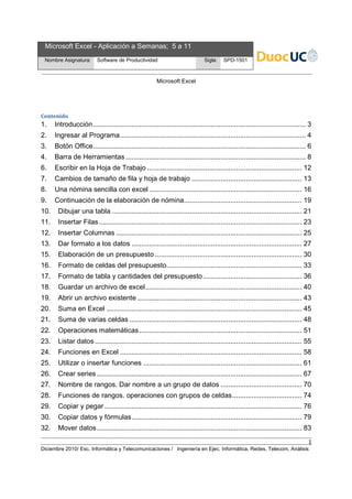 Este documento presenta una guía sobre el uso de Microsoft Excel. Explica cómo abrir el programa, identificar los elementos de la interfaz como la barra de herramientas y la hoja de trabajo. También muestra cómo escribir datos, cambiar el tamaño de filas y columnas, y crear una nómina sencilla con nombres, departamentos y cargos de 10 empleados.