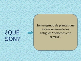 Las cícadas son un grupo de plantas que evolucionaron de los antiguos helechos con semilla. Existen alrededor de 200 especies descritas de cícadas, 42 de las cuales se encuentran en México. Las cícadas son plantas perennes que pueden vivir más de 2000 años, tienen tallos gruesos con grandes hojas y sus semillas se encuentran en grandes conos de colores brillantes.