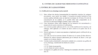 Este documento describe los procedimientos de control de calidad interno de un laboratorio clínico. Explica cómo construir gráficas de control y aplicar reglas estadísticas como las de Westgard para identificar errores sistemáticos y aleatorios. También cubre la importancia de la participación en programas de control de calidad externo y cómo evaluar la competencia analítica del laboratorio mediante el cálculo del error total.