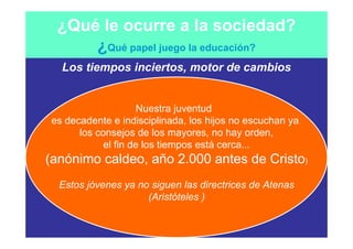 Este documento discute los cambios en la sociedad y la educación. En 3 oraciones o menos: La educación debe adaptarse a las necesidades cambiantes de la sociedad de la información. Las competencias básicas son conocimientos esenciales que todos deben tener para participar plenamente en la sociedad. La educación debe enfocarse más en el aprendizaje significativo y las habilidades prácticas en lugar de contenidos académicos tradicionales.