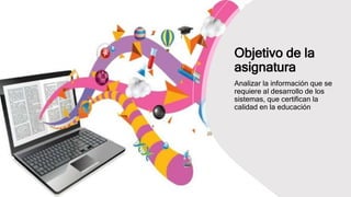 La asignatura de la maestría en calidad y procesos de innovación educativa se centra en el análisis de la información necesaria para desarrollar sistemas que certifiquen la calidad en la educación. Se abordan temas como la importancia de la certificación, la cultura de calidad, su evolución histórica y las herramientas básicas. La metodología incluye exposiciones, cuestionarios y desarrollo de proyectos.