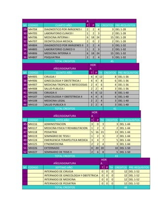 Este documento presenta el plan de estudios de 7 años de una carrera de medicina. Describe 52 asignaturas agrupadas en 7 años, con sus horas de teoría y práctica, créditos y pre-requisitos. El plan de estudios comienza con asignaturas básicas del primer año y va profundizando los contenidos médicos en años posteriores, hasta los internados especializados del séptimo año.