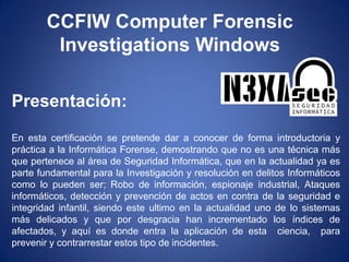 Este documento presenta un curso de certificación en informática forense para Windows. El curso consta de 8 módulos que cubren temas como la introducción a la informática forense, el establecimiento de un laboratorio forense, la obtención y análisis de evidencia digital, la recuperación de archivos, la esteganografía y la documentación de la evidencia. El objetivo es enseñar técnicas forenses prácticas para investigar delitos informáticos a través del análisis de sistemas, archivos y otros medios digital