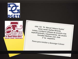 El documento proporciona instrucciones detalladas para descargar e instalar el programa CCleaner en una PC. Explica los pasos de búsqueda del programa en línea, descarga del archivo, aceptación de permisos, selección de idioma e instalación en los documentos. Luego guía al usuario a través de la configuración inicial y ejecución del limpiador para analizar y eliminar archivos y aplicaciones no deseados.