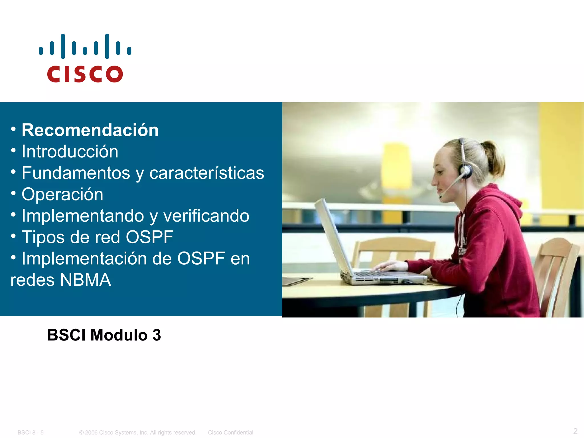 Este documento proporciona una introducción al protocolo de enrutamiento OSPF. Explica los 5 pasos clave en la operación de OSPF: 1) establecimiento de adyacencias, 2) elección de DR y BDR, 3) descubrimiento de rutas, 4) selección de las mejores rutas utilizando el algoritmo SPF, y 5) mantenimiento de la información de enrutamiento. También resume los diferentes tipos de paquetes OSPF y la estructura de datos estado de enlace.