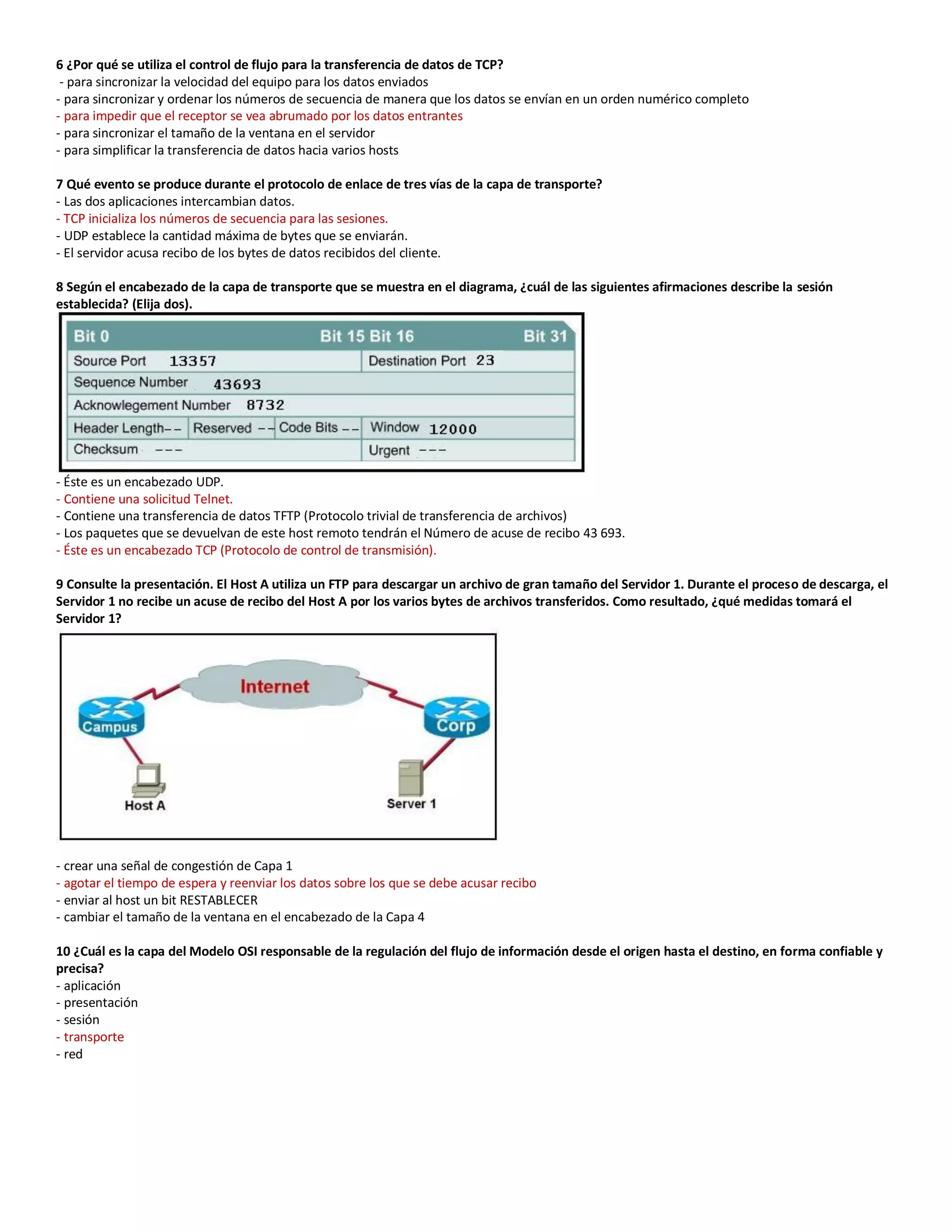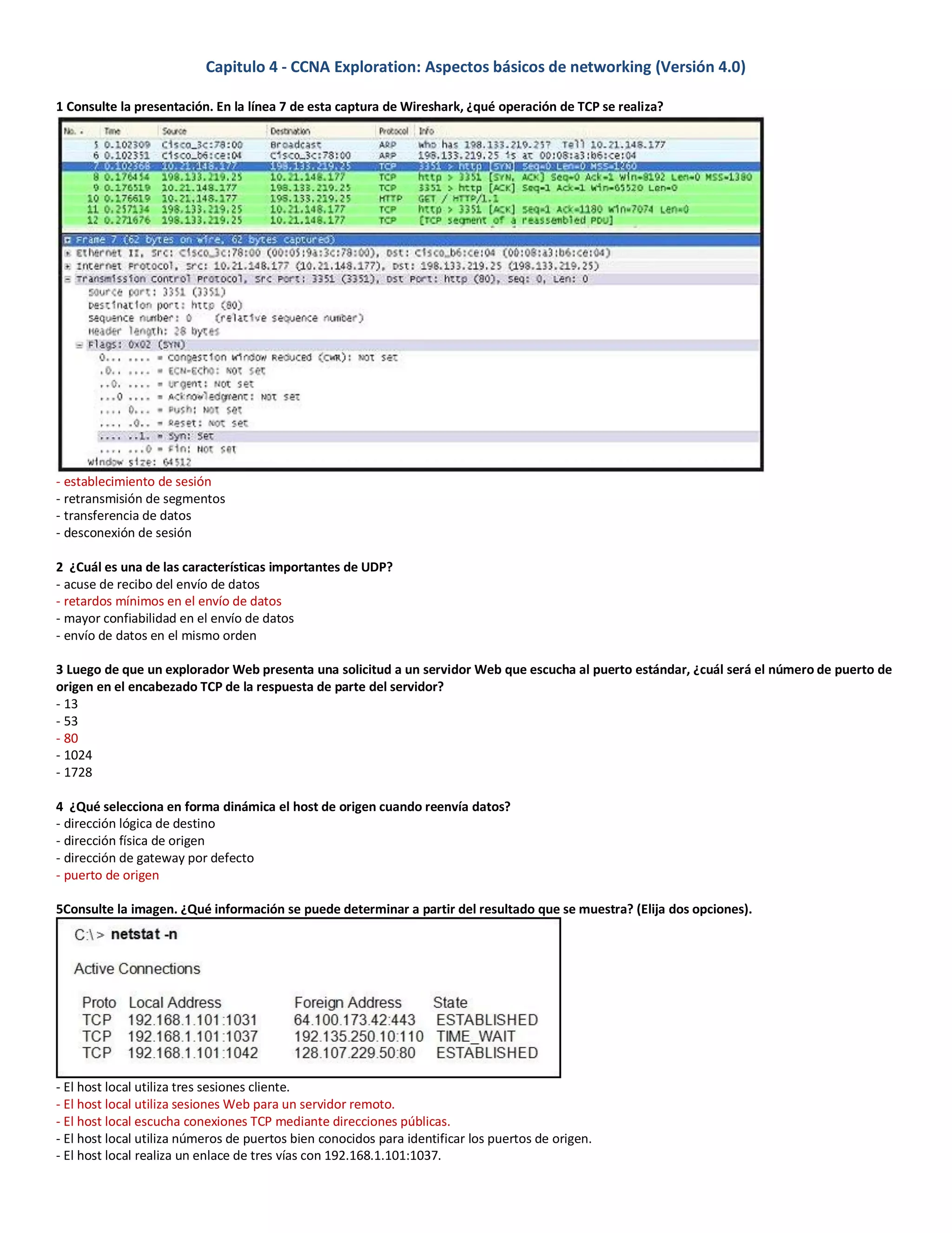 Este documento presenta 19 preguntas sobre conceptos básicos de redes TCP/IP, incluyendo características de los protocolos TCP y UDP, establecimiento de sesiones TCP, números de puertos y direccionamiento de capa 4. Las preguntas cubren temas como control de flujo, confiabilidad, sin conexión, encapsulamiento y encabezados TCP/UDP.