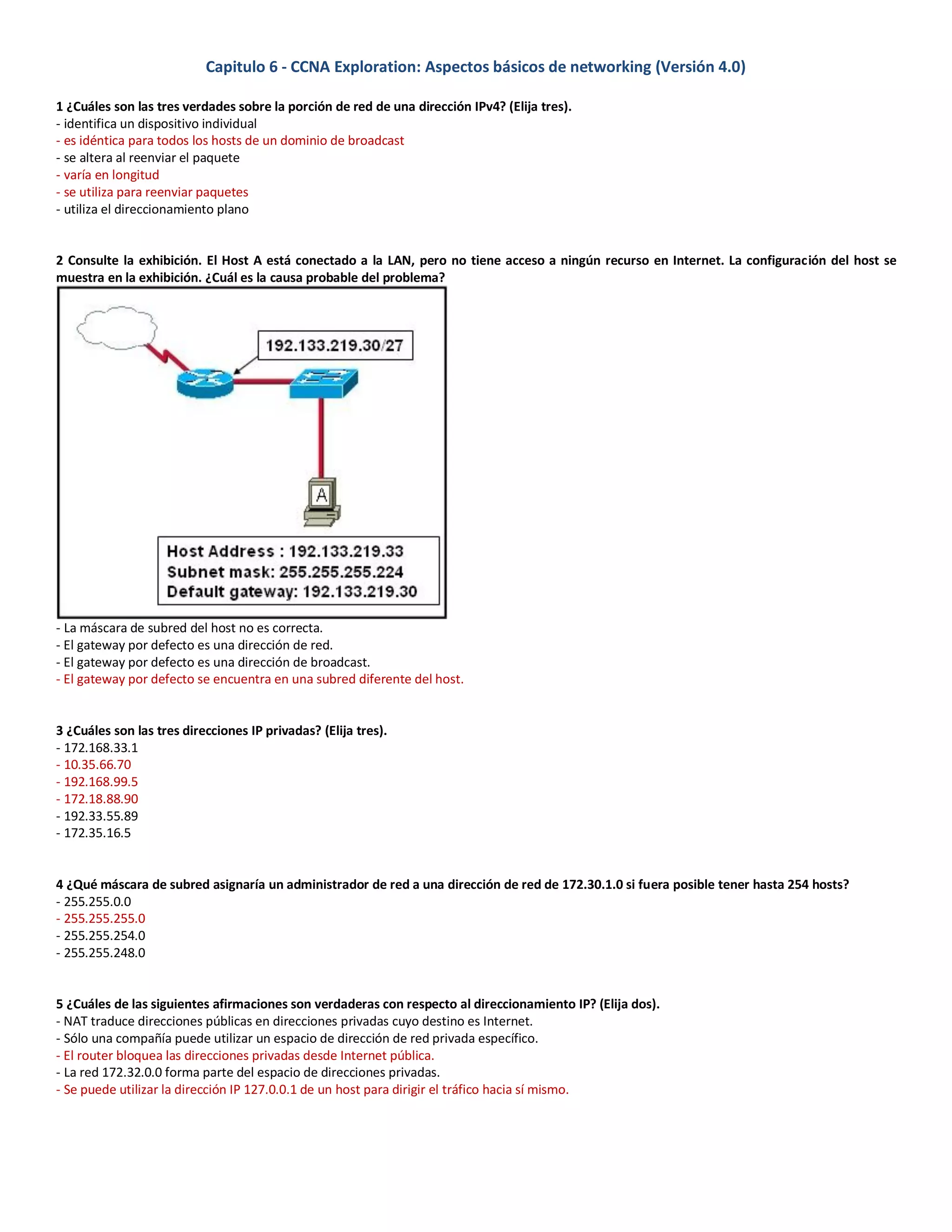 Este documento contiene 21 preguntas de opción múltiple sobre conceptos básicos de redes IP como direccionamiento IPv4 e IPv6, subredes, máscaras de red, direcciones privadas y públicas, y funciones básicas de routers. Las preguntas abarcan temas como componentes de una dirección IP, configuración de hosts, espacios de direcciones privadas, cálculo de subredes, procesos de enrutamiento, y características distintivas de IPv6.