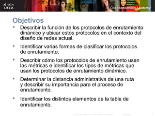 Los protocolos de enrutamiento dinámico comparten información entre routers para actualizar automáticamente las tablas de enrutamiento cuando cambia la topología de red y determinar la mejor ruta a un destino. Estos protocolos se clasifican en protocolos de gateway interiores (IGP) o exteriores (EGP). Los IGP incluyen protocolos classless que envían máscaras de subred y classful que no lo hacen. Las métricas como conteo de saltos, ancho de banda y retardo se usan para determinar la mejor ruta, mientras que