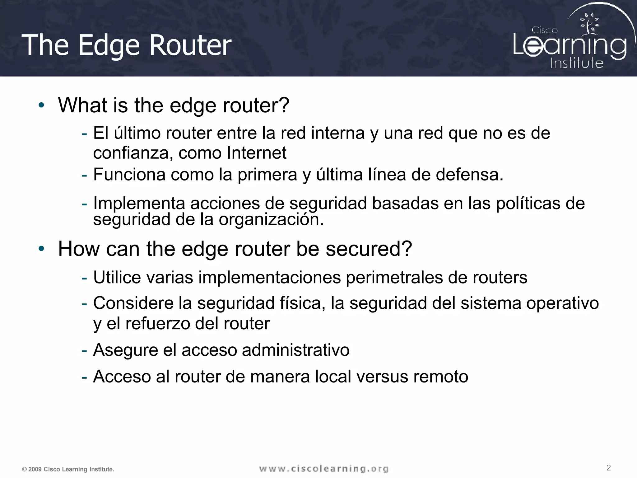 Este documento describe varias técnicas para asegurar los routers de borde, incluyendo el uso de múltiples routers perimetrales, seguridad física y del sistema operativo, y autenticación de acceso administrativo. También cubre temas como mensajes de banner, SSH, syslog y NTP para lograr una gestión segura de los dispositivos de red.