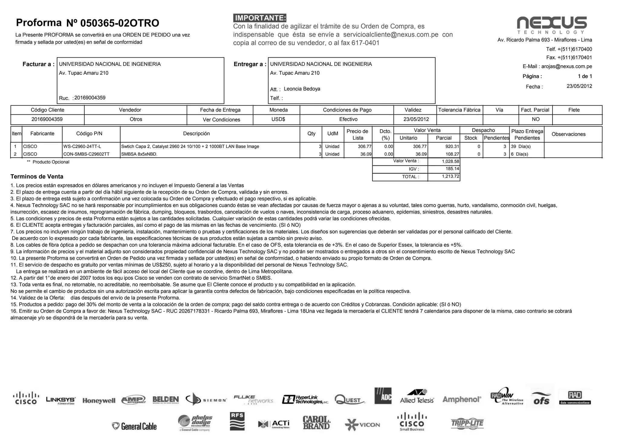 Este documento es una proforma de venta de equipos de red Cisco dirigida a la Universidad Nacional de Ingeniería. La proforma detalla 3 switches Catalyst 2960 y servicios de soporte asociados por un total de $1,213.72 dólares estadounidenses. La proforma especifica los términos de la venta como plazos de entrega, pagos y devoluciones.