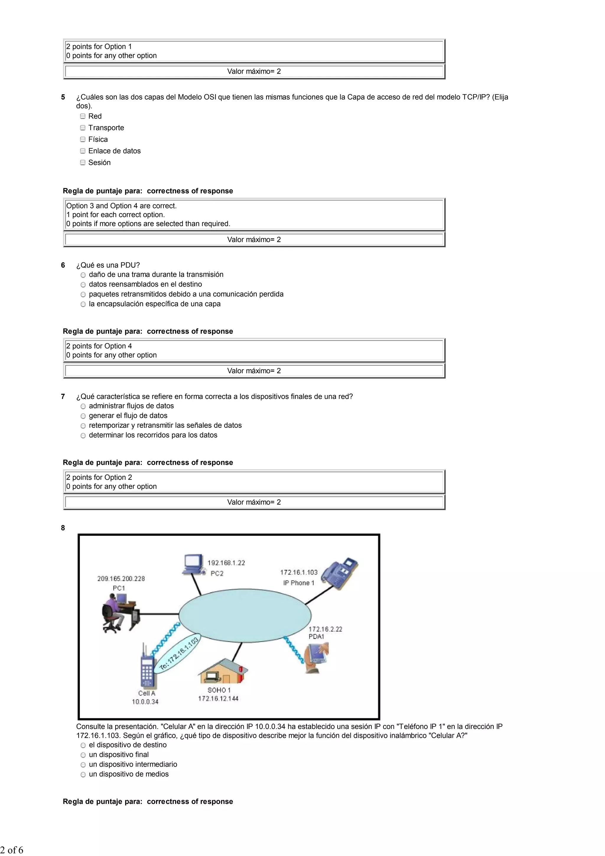 Este documento contiene preguntas de opción múltiple sobre conceptos fundamentales de redes, incluidos protocolos, capas del modelo OSI, roles de dispositivos de red y aplicaciones de red comunes. Las preguntas cubren temas como protocolos de capa de aplicación como FTP, DNS y correo electrónico; modelos de red cliente-servidor y entre pares; y funciones de capas de red, enlace de datos y transporte en el proceso de encapsulación.