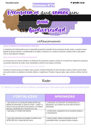 Este documento describe las fortalezas y amenazas de la biodiversidad en Perú. Entre las fortalezas se encuentra que la constitución peruana protege la biodiversidad y que existen ministerios e instituciones dedicadas a proteger el medio ambiente. Las principales amenazas son la urbanización, deforestación, contaminación, cambio climático y especies invasoras. El documento concluye preguntando sobre la importancia de conservar la biodiversidad y cómo hacer un uso sustentable de los recursos naturales.