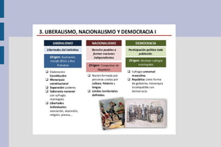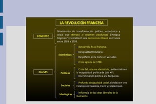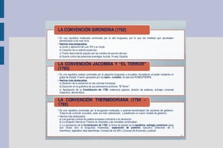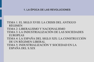 El documento resume los principales temas de la época de las revoluciones del siglo XVIII y XIX en Europa. Se describe el estallido de la Revolución Francesa en 1789, las diferentes etapas por las que pasó, el Imperio Napoleónico y su caída, el surgimiento del liberalismo y nacionalismo como fuerzas opositoras a la Restauración monárquica, y las revoluciones liberales y nacionales que tuvieron lugar en la década de 1820.