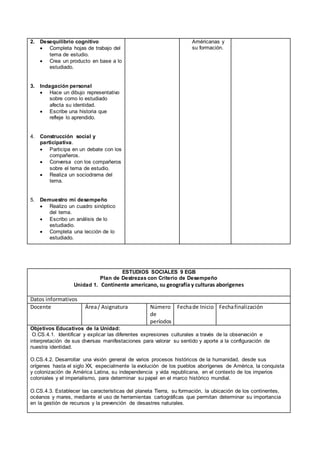 Este documento presenta un plan de estudios para una unidad sobre el continente americano, su geografía y culturas aborígenes. Los objetivos incluyen identificar expresiones culturales, analizar la evolución de los pueblos aborígenes de América y civilizaciones como los mayas y aztecas, y explicar el desarrollo de las culturas andinas previas a los incas. Se describen estrategias de enseñanza y evaluación para lograr estos objetivos.
