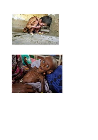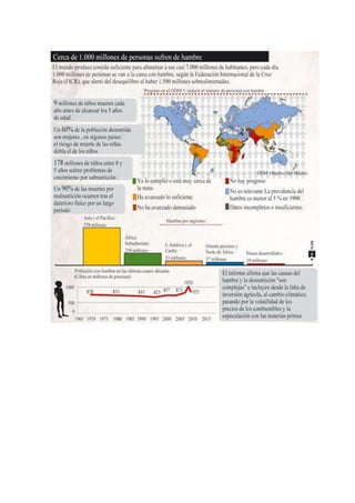El documento describe la grave situación del hambre en África. Millones de personas, especialmente en Somalia, Kenia y Etiopía, están en riesgo de morir de hambre debido a la sequía. La organización Unicef advierte que 500,000 niños menores de 5 años podrían morir si no reciben alimentos y atención médica de emergencia. Además, el grupo radical Al Shabab controla partes de Somalia y se opone a la entrada de ayuda humanitaria. La comunidad internacional necesita tomar medidas urgentes para abordar esta crisis human